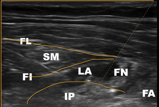 FL- Fascia Lata, FI- Fascia Iliaca, LA- Local Anaesthetic, SM- Sartorius Muscle, IP- Iliopsoas Muscle, FN- Femoral Nerve, FA- Femoral Artery