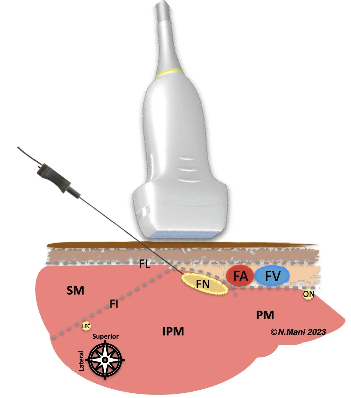 FN- Femoral Nerve, FA- Femoral Artery, FV- Femoral Vein, ON- Obturator Nerve, LFC- Lateral Femoral Cutaneous Nerve